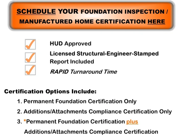 Any additions/attachments to the home may also be required to be checked for compliance by your lender/underwriter. We HIGHLY RECOMMEND verifying this BEFORE your foundation certification appointment, as it's worth the savings in time and money to complete both of the inspections/certifications together...see the bundled pricing option below.